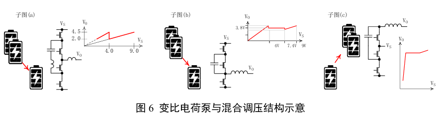 图6是变比电荷泵、混合结构降压和混合结构升压的示意。子图(a)电路在2:1和1:1两个比例间切换。以两串电池应用为例,经该电路调理,在负载侧看,可以使两串电池像是单节电池一样;转换到两节电池供电时负载可以沿用为单节电池设计的电路。混合结构调压将固比电荷泵调理部分与电感开关稳压结构合并在一起,牺牲了电荷泵时间上的对称性,减少了开关数量14;产品设计多以交错多相提高等效频率和分散应力。变比电荷泵在变比变化瞬时出现较大压差,电容充放会产生电流浪涌和相应损耗,不适合于频繁变化变比的应用。