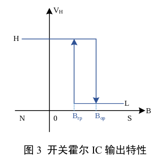 开关霍尔IC是一种将霍尔元件与信号调理IC集成的数字式磁传感器。其工作原理是内部比较器将霍尔电压与预设阈值比较,将连续的磁场信号转换为由电源电压决定的高/低电平,从而驱动数 字输出。为确保开关动作稳定需创建一个“迟滞区”,如图3所示,其动作点(Bop)与释放点(Brp) 满足Brp < Bop的关系,从而有效防止了在临界磁场附近输出信号出现快速、反复的抖动。