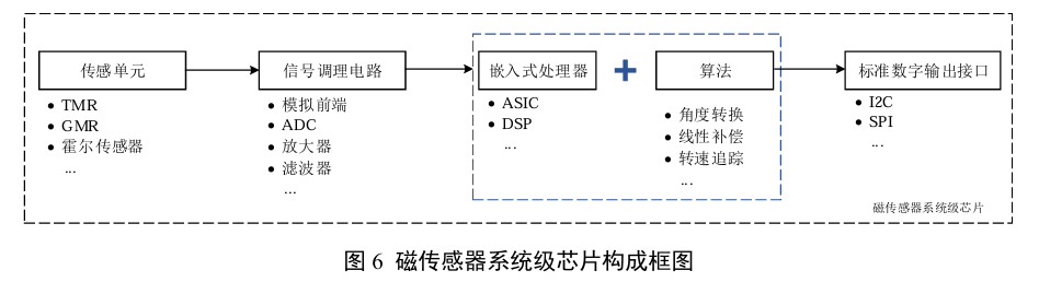 系统级芯片在单磁头级敏感单元的基础上,通过半导体工艺将完整的信号处理链与智能功能集成于单一封装内,构成一个功能完备的微型测量系统。该类芯片内部融合高精度传感单元(如TMR)、信号调理电路、嵌入式处理器及智能算法、标准输出接口(架构如图6所示),能够直接输出经过放大、线性化、温度补偿后的稳定模拟信号或通过I²C、SPI等标准接口输出的数字信号。