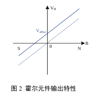 霍尔元件是一种基础、通用的磁敏元件。其输出为几十至几百毫伏的模拟电压信号,后续电路 的设计可灵活地将此信号处理为数字或模拟形式。其输出电压与垂直磁场强度成正比,如图2中蓝 色虚线所示。通过输出电压 VH的正负可以反映磁场方向(输出正电压→电压高于零点→正方向磁场,N极朝向传感器;反之,输出负电压→电压低于零点→负方向磁场,S极朝向传感器)。理想情 况下,若无垂直磁场施加,输出电压为0。但实际上即使无磁场作用,输出端也存在一个非零的偏置 电压Voffset,如图 2蓝色实线所示,这是设计与校准中需要考虑的关键参数。