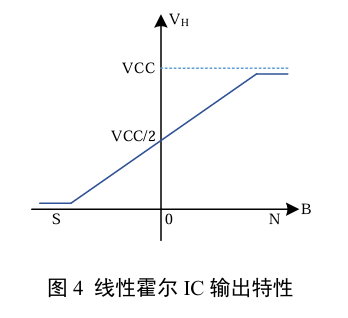 线性霍尔IC是一种模拟输出的集成磁传感器。它在霍尔元件后级集成了高增益放大器,能输出一个与磁场强度线性相关且经过放大的电压信号,输出范围由电源电压VCC决定。输出特性曲线如图4所示,静态零点通常设置在电源电压的一半,使得输出能围绕此中点,根据磁场方向在0V至VCC的满幅范围内变化,实现方向辨别(磁场方向辨别方法与霍尔元件类似)。若采用轨对轨输出架构,可最大限度地利用电源电压的动态范围,提高信噪比和分辨率。
